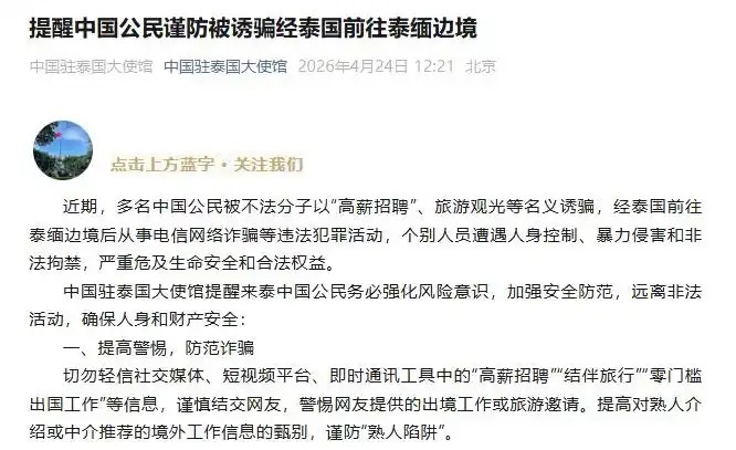 原标题:提醒中国公民谨防被诱骗经泰国前往泰缅边境近期,多名中国公民被不法分子以“高薪招聘”、旅游观光等名义诱骗,经泰国前往泰缅边境后从事电信网络诈骗等违法犯罪活动,个别人员遭遇人身控制、暴力侵害和非法拘禁,严重危及生命安全和合法权益。中国驻泰国大使馆提醒来泰中国公民务必强化风险意识,加强安全防范,远离非法活动,确保人身和财产安全:一、提高警惕,防范诈骗切勿轻信社交媒体、短视频平台、即时通讯工具中的“高薪招聘”“结伴旅行”“零门槛出国工作”等信息,谨慎结交网友,警惕网友提供的出境工作或旅游邀请。提高对熟人介绍或中介推荐的境外工作信息的甄别,谨防“熟人陷阱”。二、依法出入境,远离高风险区域严格遵守泰国及有关国家法律法规,切勿非法越境或贸然前往边境地区。非法出境不仅面临人身风险,也将承担法律责任。三、通过正规渠道求职务必通过合法中介或正规企业获取就业信息,认真核实用工单位资质、工作地点及内容,提前办妥工作签证,签订合法劳动合同,警惕“到岗再签合同”等说辞。四、保护个人信息和证件安全妥善保管护照等重要证件,不随意交由他人保管,防止被控制或限制人身自由。五、保持通讯畅通,告知亲友行程出境前将行程、工作地点及联系方式告知家人,尽量结伴出行,同亲友保持定期联系。如通讯突然中断,应引起高度重视和警惕。六、如遇紧急情况及时求助如遭遇诱骗、拘禁或其他危险,应在确保自身安全前提下,尽快联系当地警方或中国驻泰使领馆求助,也可向国内亲属求助报警。七、警惕参与违法犯罪的法律后果电信网络诈骗等违法犯罪行为将受到中国及有关国家法律严惩,切勿抱有侥幸心理参与其中,以免承担严重法律责任。相关联系方式:泰国报警电话:191泰国急救电话:1669泰国旅游警察热线:1155(提供中文服务)外交部全球领事保护与服务应急热线电话(24小时):+86-10-12308或+86-10-65612308驻泰国使馆领事保护与协助电话:+66-2-245-7010驻清迈总领馆领事保护与协助电话:+66-81-882-3283驻宋卡总领馆领事保护与协助电话:+66-81-766-5560驻孔敬总领馆领事保护与协助电话:+66-80-936-6070驻宋卡总领馆驻普吉领事办公室领事保护与协助电话:+66-94-595-6158