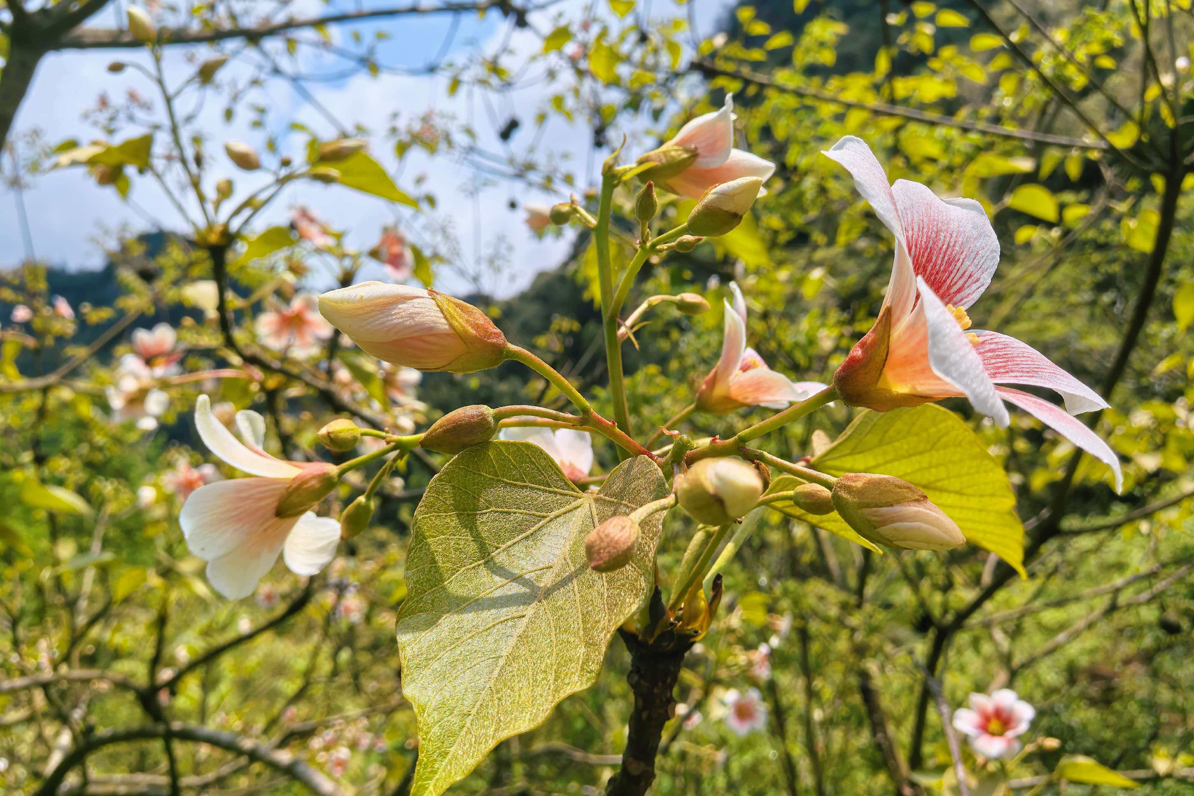 春日白虎堂,繁花与山水相映成趣。粉白桐花、艳紫杜鹃肆意绽放,不事雕琢,与峰林、溪涧构成绝美图景,成为市民拍照留影的热门打卡点。